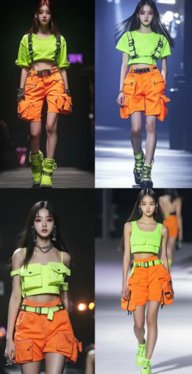 Vogue Runway. K-pop idol wearing minimalist, short hip-hop street fashion - a neon green top and orange shorts with multiple pockets and a belt. --ar 22:41 --style raw